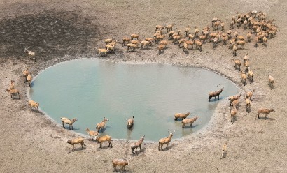 在江苏大丰麋鹿国家级自然保护区,一群麋鹿在水塘附近栖息。